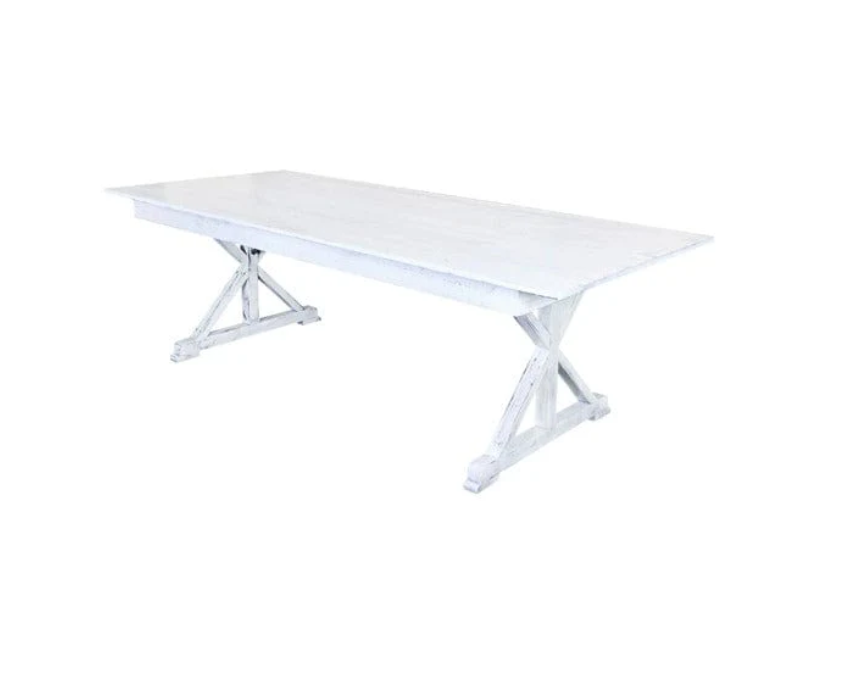 White, distressed farm table. Use one for a cake table, gift table, etc. Use two together for the wedding party.